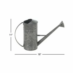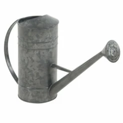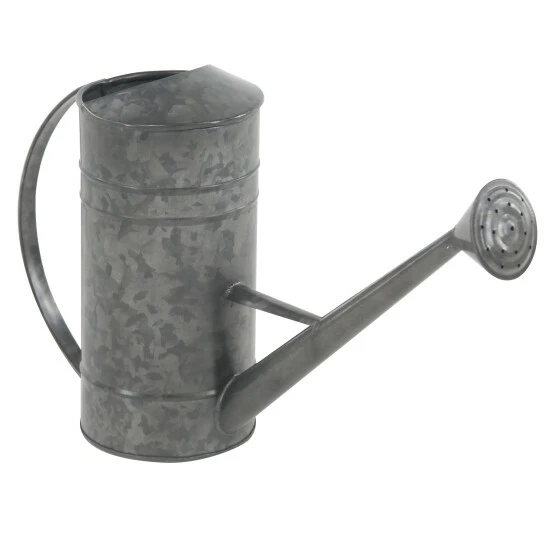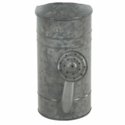 - Tall cylinder watering can with a dimensional galvanized metal finish, sealed top with a large opening to pour in water and flower display, and long metal handle