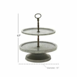 A elevated tiered server that you can store your small decorative goods, trinkets or even jewelry in your dining room, living room or bedroom. Let this tiered server provide a sense of style and function to your home. Whether in your kitchen, or on your coffee table, it’s a great way to display and store your favorite things. This item comes shipped in one carton. Suitable for indoor use only. Some assembly required. Made in India. Farmhouse-themed style. Please note that this item is for decorative purpose use only and are not food safe.