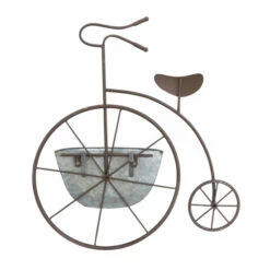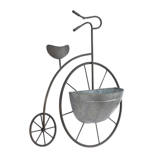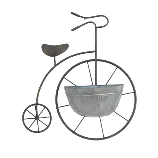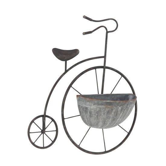 This metal wall planter brings tranquility to your space by allowing you to fill it with plantsโhence it promotes wellness and creates an immediate feeling of relaxation. This decorative planter is sure to add bundles of charm to your home. Beautifully detailed, it features a distressed gray finishing with rusted brown highlights and a semi-circular basket planter attached to its front wheel. This wall planter is made out of iron with solid construction, offering durability. Jazz up country cottage and farmhouse themed spaces using this charming accent piece that is ideal for outdoor use. This vintage-inspired bicycle wall plant holder is ideal for farmhouse, natural, and country cottage-themed gardens and living spaces Wipe clean with a dry cloth. Two loop hardware at the center section of the wheel allows for easy hanging via nails or screws. Suitable for indoor and outdoor use. Industrial inspired. This item comes shipped in one carton. Maximum weight limit is 5 lbs. per shelf.
