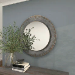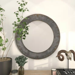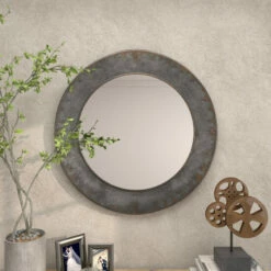 Add some style to your entryway, lobby, living room, or bedroom with this striking metal and wood wall mirror. This accent piece features a round frame in metallic gray finish and a circular reflective mirror in the center that will surely beautify any space. With its impressive look, this stunning mirror suits any home with an industrial interior design. Apart from decorating your home, the purpose of this mirror is to bounce back outdoor light to a small room to make it look bigger. Pair this decorative wall mirror with house plants or other wall decor accent pieces to blend everything together perfectly. There are keyholes on the back for easy hanging. Suitable for indoor use only. This item comes shipped in one carton.