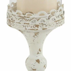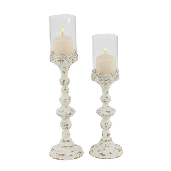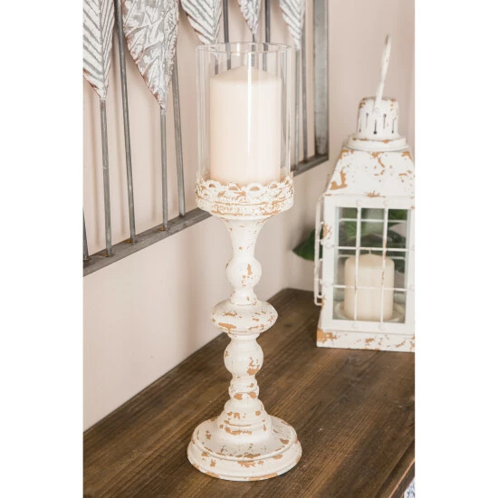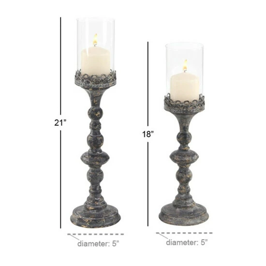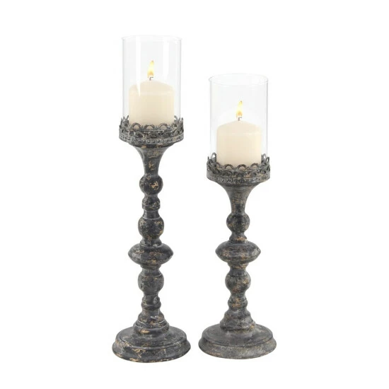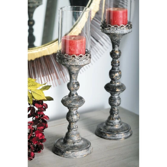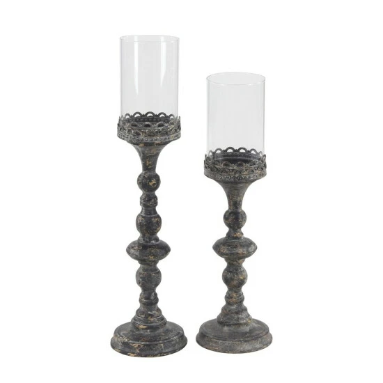 Update your rustic living room decor with these matching candleholders. The sturdy iron frames feature baluster-style bodies and distressed grey finishes. Complete the look with your favorite scented candles.
