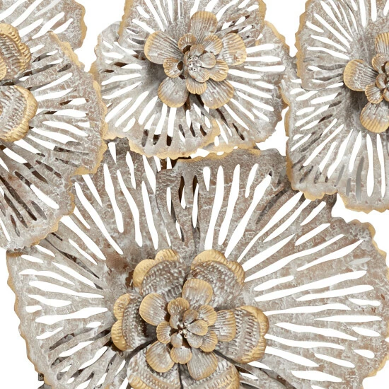 Full of rustic and eclectic style, this large floral wall art hanging features solid pierced iron flower sculptures with whitewashed finishes and gold accents. The large flowers are welded in a staggered, layered line to create vivid dimension, making this a great centerpiece in your living room or dining room. The neutral colors will work with any color palette and really pop when displayed on a solid colored wall. Easy and ready to hang, this metal wall decor will be the perfect finishing touch in your rustic, farmhouse, or eclectic-style space!