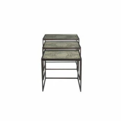 - Nesting tables with iron frames with carved MDF wood designs topped with clear glass