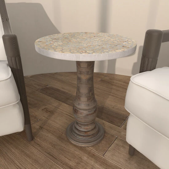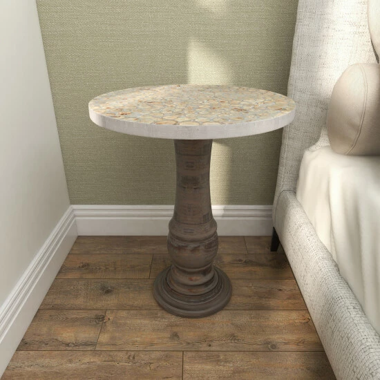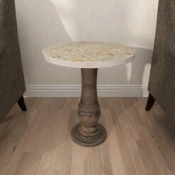 - This wooden side table features small wood inlays forming a parquet style mosaic on the round tabletop