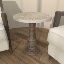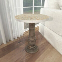 - Round accent table measures 18″L x 18″W x 21.5″H and weighs 12 lbs