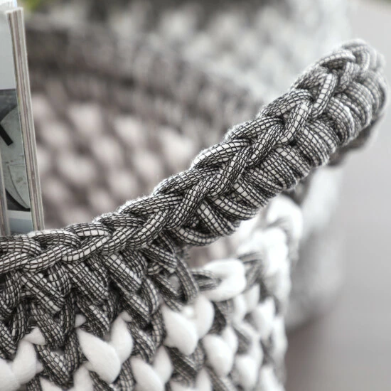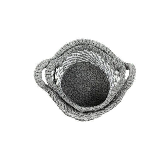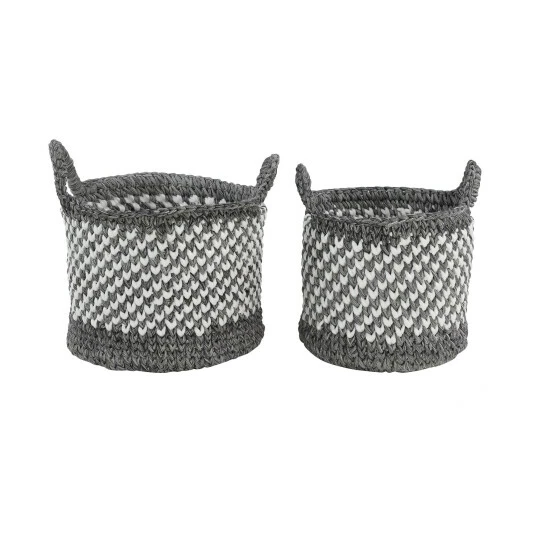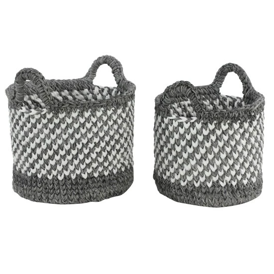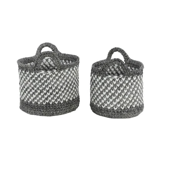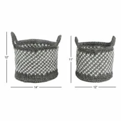 - Each storage basket features gray and white weave patterns with 2 woven side handles