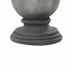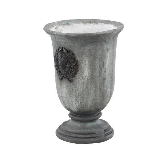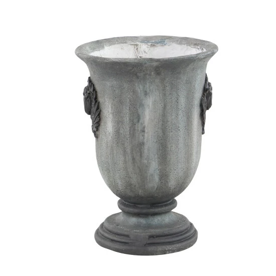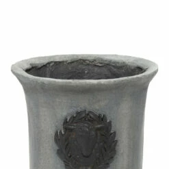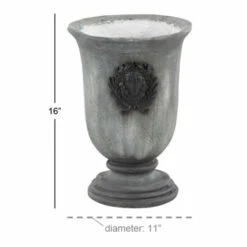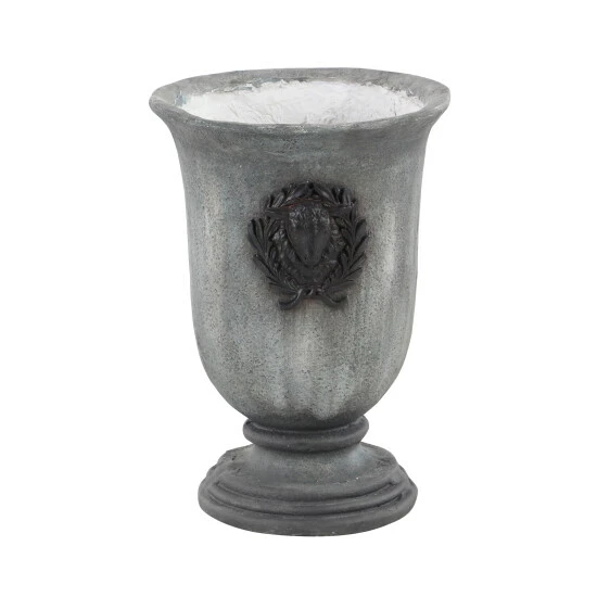 This extra-large, tall outdoor planter has a textural gray brushed finish over the urn-shaped silhouette and a dark gray carved round base. A dimensional decorative wreath cartouche with a goat head in the center, both painted black, jut out from the front and back of the stone-like body, adding bold dimension and style. Display your potted plants and flowers in this large decorative planter indoors or outdoors. Use this planter in an entryway or on your patio to show off your plants Wipe clean with a dry cloth. Suitable for indoor and outdoor use Pots do not have drainage holes Rustic design. This item comes shipped in one carton.