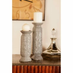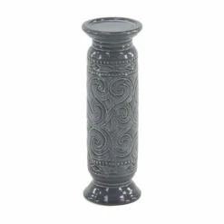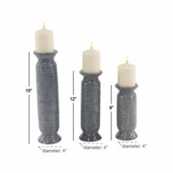 Step up your home’s atmosphere with the timeless beauty of these candle holders from Studio 350. Crafted from solid stoneware material, this set features three gray-finished, cylindrical bodies designed with intricate scrollwork carvings. Each piece has a tapered, round base and bobeche. Purchase these decorative and functional candle holders today to add a dramatic effect to your tabletop, shelf, cabinet and more!