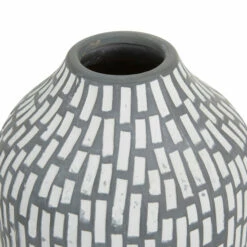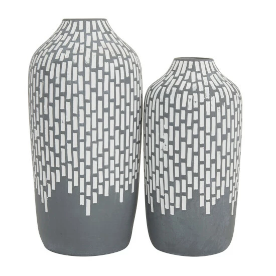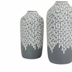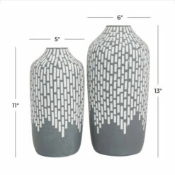 These modern ceramic vases are perfect as a set decoration for living rooms with light-toned walls and pastel-finished table decors This vase is perfect for displaying orbs filler and twigs, as well as filling up any negative space against an open surface space. Create depth and form onto your space by displaying this beautifully crafted vase. This item comes shipped in one carton. This item comes as a set of 2. Modern style. Suitable for indoor use.. Modern style inspired by a minimalistic design with clean lines and angular structures. This delicate set of urn vases are crafted from pure stoneware material. This endearing set of floral urn vases feature a matte white and gray stoneware finish. These white urn vases showcase a soft geometric inspired design featuring vertically aligned brick patterns. This set measures 6.4″D x 13″H, 5.5″D x 11″H, and weighs 4, 3.2 lbs each