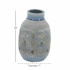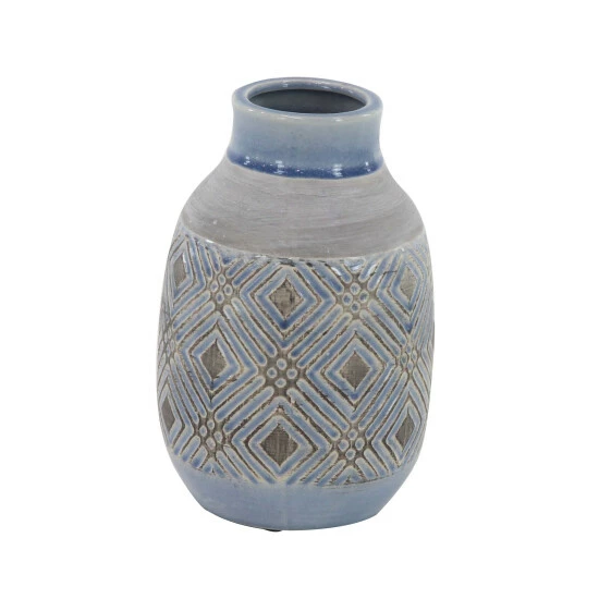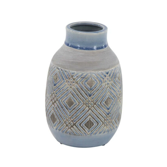 Showcase a lovely floral bouquet or collection of exotic plants with this elegant ceramic vase. Featuring rustic shades of blue and grey and an intricate geometric pattern, the vase offers a touch of timeless sophistication for any decor.
