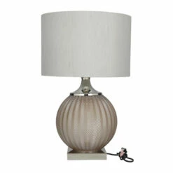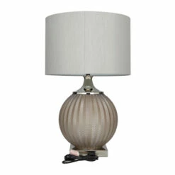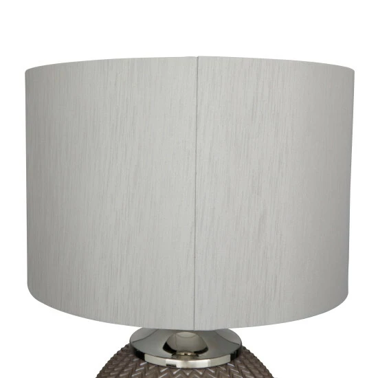 Illuminate your living room or bedroom corner with this accent table lamp to bring together the transitional theme of your indoor aesthetics. Display it on top of a console dresser or a low-lying side table with decorative orbs, hardbound books or magazines for a balanced look. This eye catching lamp makes a playful addition to your surface space and beautifully illuminate its surrounding area. Designed with black rubber stoppers at the base that prevent scratching furniture and table tops, as well as sliding around. Furnished with a socket for one medium-sized E26 bulb. This item comes shipped in one carton. Suitable for indoor use only. Features a drum polyester lamp shade. Comes with a toggle on/off switch. Transitional design.. A traditional inspired designed for classic harmony full of friendly charm. This home decor is crafted with polyester fabric shade and glass body for a classic and solid form. This table lamp highlights a muted grey shade and glossy glass body set on metallic silver base. Chevron pattern on tempered glass creates contrast with the metallic silver base and muted grey shade for a chic and elegant combination. Table lamp measure 17″L x 17″W x 27″H and weighs 9 lbs