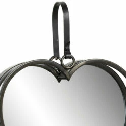This truly unique, modern style mirror wall decor features three black metal heart frames welded into a triangle silhouette, each with reflective glass heart mirror inlays and black metal candle holders at their bases. This wall sconce candle holder also boasts black leather straps connected by silver O-rings at the top, adding a modern, edge. When your candles are lit, the flames are reflected in the decorative mirrors, adding another unique style element to your modern space.