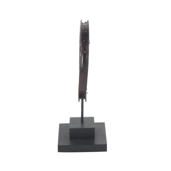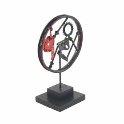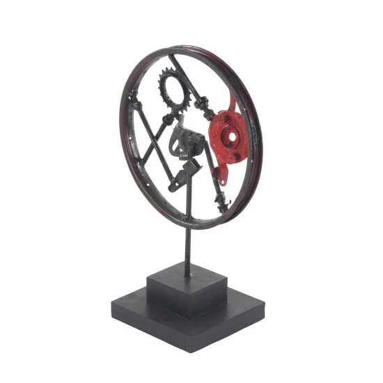 - 20″ x 12″ Rustic Reflections metal and wood dรยฉcor wheel, black wheel frame made of iron, features figures of screw and clockworks gear, black finish on square wood base
