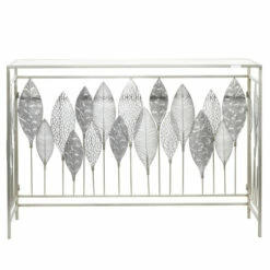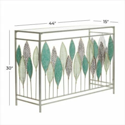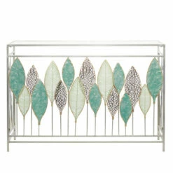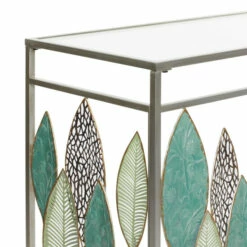 - Features rectangle-shaped table with gold / black / silver and white frame finish and leaves sculpture in shades of green