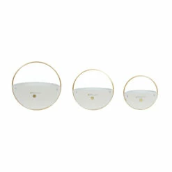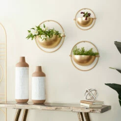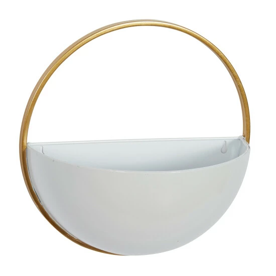 This metal planter set matches the elegance and beauty of modern and contemporary interiors. The iron frames were constructed for decorative purposes only, and these bowl-like planters hang via keyhole backings in vertical or indoor gardens. The white/black gold color combination allows green hanging plants and colorful flowers to pop when added. Pots do not have drainage holes. Simple yet neat construction is best for contemporary and modern interiors. Wipe clean with a dry cloth. Metal planters hang via keyhole backings. Suitable for indoor and outdoor use Pots do not have drainage holes. These hanging planters come as a set of 3. Contemporary design. This item comes shipped in one carton. Planters do not have drainage holes but they are not watertight.