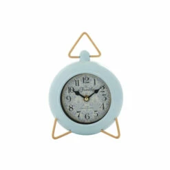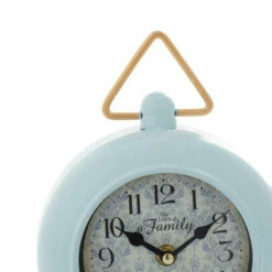 This round light blue/black/grey/red metal table clock with a triangular handle and stands gives your eclectic-themed home a blend of vintage and modern vibe. This table clock is made with a round metal frame with light powder blue/black/grey/red finish. It is designed with a single handle and 2 leg stands that are triangular-shaped with gold finish. Placed as standalone or accent decor on your office, console, or side table, this eclectic table clock is a chic addition to your contemporary or traditional home space. Requires 1 AA battery, not included. This item comes shipped in 1 carton. Arabic numbers and hash marks on a blue rococo clock face. The clock mechanism runs silent. Suitable for indoor use only. Carries a “The Love of a Family” typography. Farmhouse-themed style.