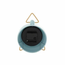 - Features a glossy light blue/black/grey/red round frame housing a botanical design and Arabic numeral printed clock face and triangle-shaped gold legs and handle
