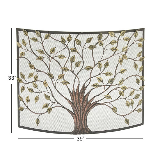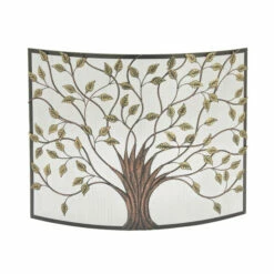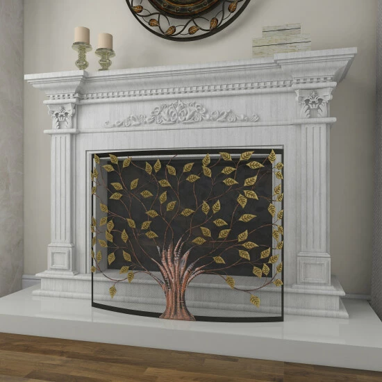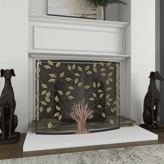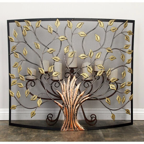 - This curved fireplace screen features an eye-catching metal tree design with thin branches and leaves
