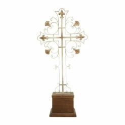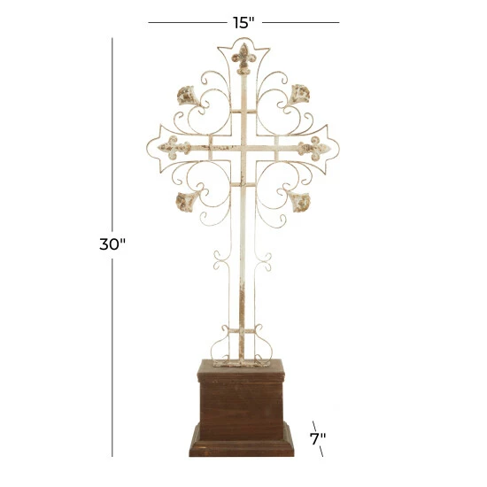 - This decorative cross ornament features a distressed white/black cross-inspired metal accent with fleur-de-lis and scroll details on a brown square wooden base