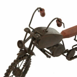This metal motorcycle decor sculpture is sure to add a vintage vibe to your space. It features intricate details with a vintage black/gold finish, save for the golden brown natural wood handles and seat. This motorbike sculpture includes a headlamp, handlebars, springs, wheels, wide seat, fender, and dirt bike style tires. These make a great accent in vintage-inspired spaces. This item is shipped in one carton. Suitable for indoor use only. Made in India. Traditional theme.