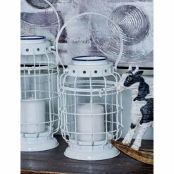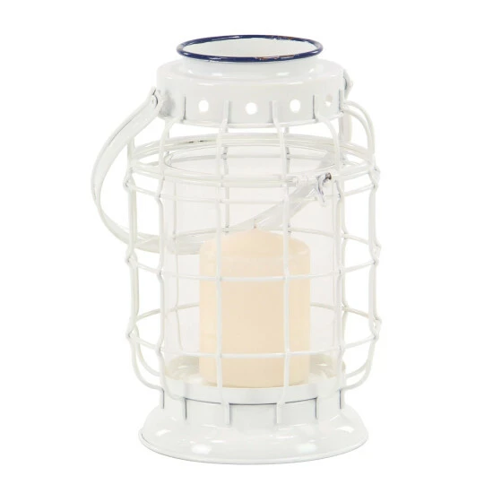 Display your candles in style with this elegant candle lantern. A cylindrical glass candle holder encloses the flickering light, while the white, cage-inspired iron frame lends timeless sophistication to any decor.