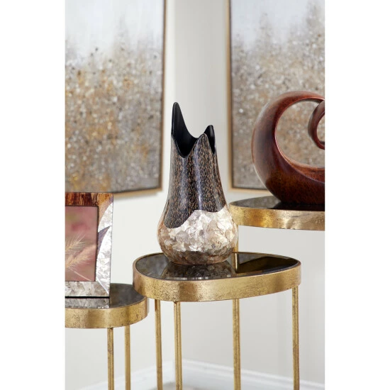 - Animated, bold centerpiece: The cylindrical upper body and gourd base of this resin vase has a waving ridge effect around the opening with multi-colored, textured Jamaica vervain in a leopard-print like pattern on the outer and a solid, opaque black glaze on the interior; the vervain drips into the bottom layer of opalescent capiz shell inlay; a truly stunning centerpiece with layers of color, texture, movement, and dimension for your dining room or living room decor in your rustic, natural, or coastal themed space; looks especially magnificent placed against a solid colored wall