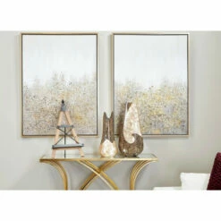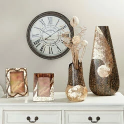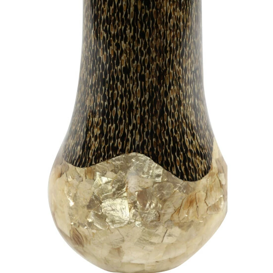 Let this large, laminated, golden capiz shell & Jamaica vervain vase do the talking in your rustic decor home… With a large mouth wrapped in rigid, wavy movement, a gourd-shaped silhouette, black, gold and beige Jamaica vervain, and opalescent champagne and gold-colored capiz shells hand-inlaid over the resin body, absolutely nothing about this unique and decorative vase is ordinary! Display this large vase solo as your table centerpiece, or fill with a bundle of beautiful, fresh-cut flowers to add even more kaleidoscopic color to your space. Place this striking vase where light hits to experience the full spectrum of reflective dimension! Don’t let your eyes deceive you: this entire patterned vase is laminated and smooth to the touch.