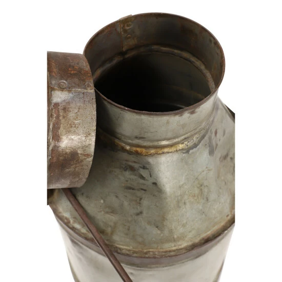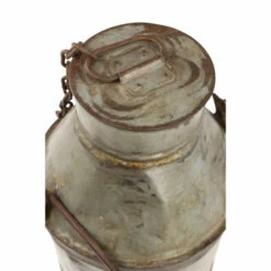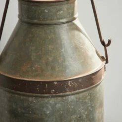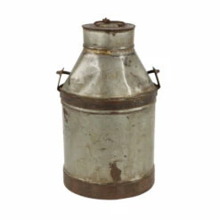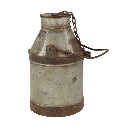 Crafted after a 100-year-old antique metal milk drum or “milk churn” handmade in India. These types of jugs were used to securely transport and deliver milk and cream to customers. Its conical shape kept the metal drum from tipping during railway and wagon transport, and the chain was used to keep the lid attached during manual filling on farms.