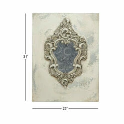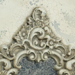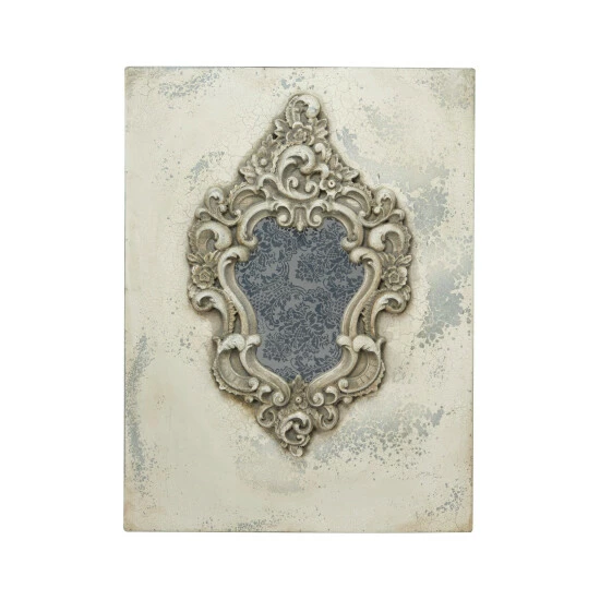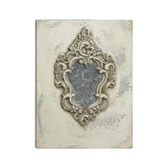 This large, rectangular wooden wall art features an ornate antique style frame sculpture housing a white and gray damask pattern, all encompassed by a crackled gray and beige stone-like wall plaque. The multiple textures and patterns, decorative distressing, and classic vintage frame sculpture brings timeless antique style to your Farmhouse, vintage, or country cottage style walls.