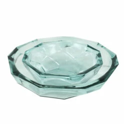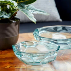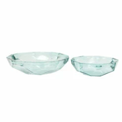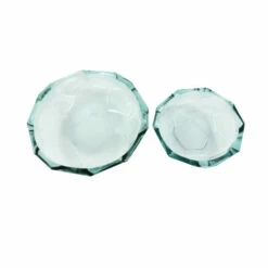 Add some geometric dimension to your decor with this set of 2 gorgeous soda lime glass dishes, measuring 13″ and 9″, both 3″ tall, and featuring a unique origami shape design. The glass is completely clear and transparent with a greenish hue, known as soda lime glass, that gets even darker in the thick areas, especially around the very wide rim, giving this pair of glass bowls dimension and a subtle splash of calming color.