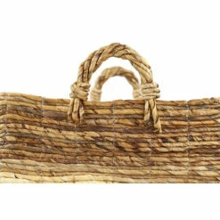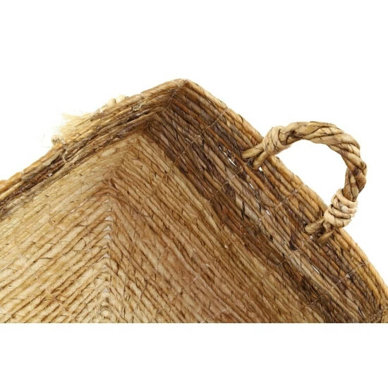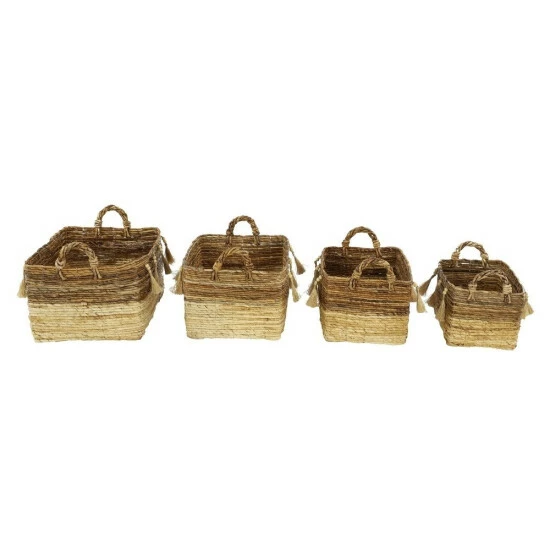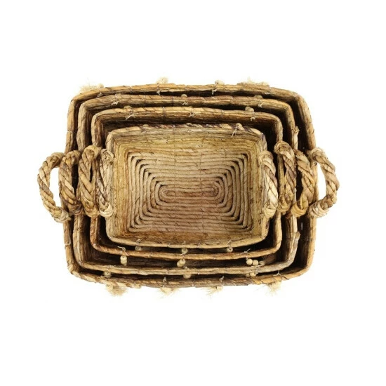 Solve your storage issues stylishly with this set of 4 naturally brown and beige, large rectangular storage baskets, handmade with banana leaf wicker. Each eclectic wicker basket has beige wooden beads dropping beige tassels around the top. The thick, twisted handles on the sides are made from sun-dried banana leaves, jutting out from the rectangular body, which displays tightly stacked wicker cords secured by clear line for a tight, coil-woven striped design. The clear acrylic string creates a subtle starburst pattern on the interior base for a little extra hidden pop of style! These rectangular baskets nest together for easy (very cool looking) storage.