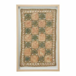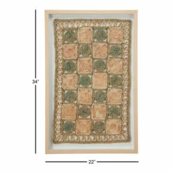 Natural, earth tones are spun throughout this textural, rectangular rope shadow box. Housed in a naturally light beige pine wood frame, this large rectangular wall decor piece displays dimensional spiraled ropes forming a checker board pattern with neutral beige, sage green, and muted Himalayan pink hues. Rich texture and dimension from the shadow box brings natural style and pattern to any wall while the versatile hues work with almost any color palette.