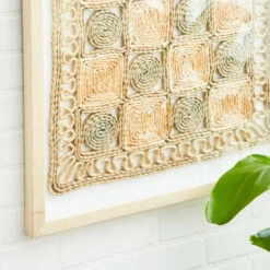 - Natural wall art with wicker-textured rope spiraled into circles and squares that form a large, rectangular checker board pattern; neutral earth tones of light beige, muted sage green, and brushes of a Himalayan pink salt color
