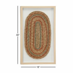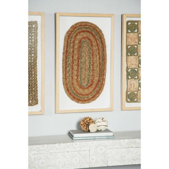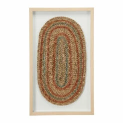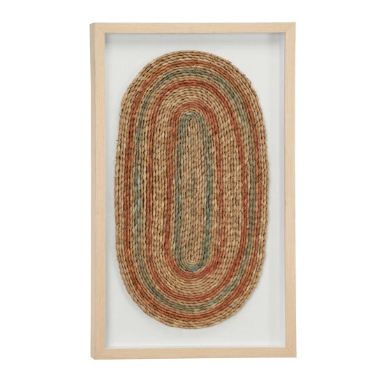 Soft earthy tones are spun throughout this textural, oval rope shadow box. Housed in a naturally light beige pine wood frame, this large rectangular wall decor piece displays a dimensional wound rope into a large oval spiral with soft neutral tones, including terracotta, wheat beige, muted coral, sage green and a bit of dusty blue.