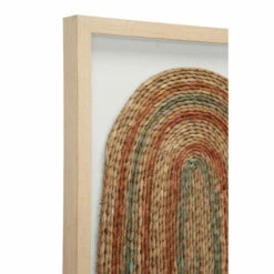 - Natural wall art with wound, twisted wicker-textured rope forming a large oval shape; neutral earth tones of terracotta, wheat beige, muted coral, sage green and a bit of dusty blue