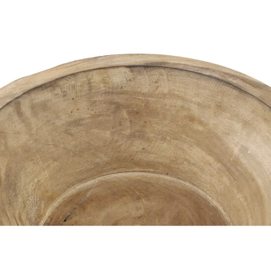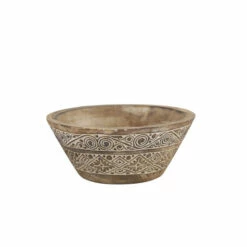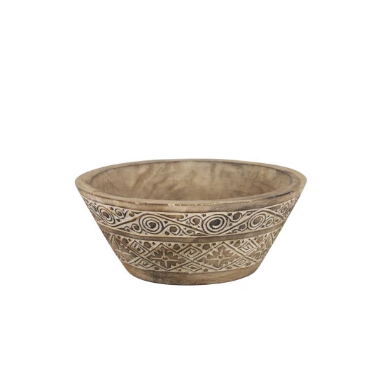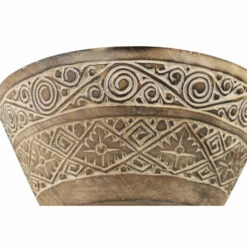 - Carved wood bowl with very textural and distressed wood in light brown, mocha brown, and white hues; hand-carved designs have spirals, triangles, and zigzags that have a tribal feel