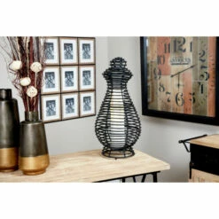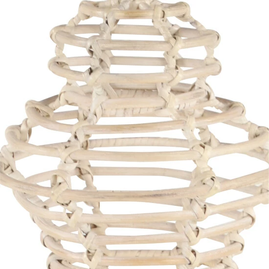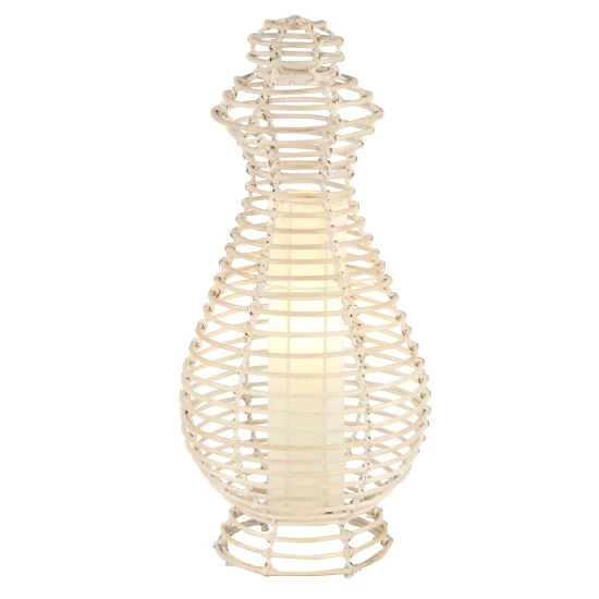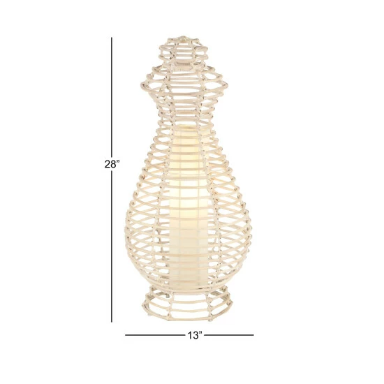 Full of rustic charm, this very large, decorative lantern accent lamp is handmade with natural palm rattan. The unique rounded amphora shape complements both rustic and modern styles and adds texture with soft illumination to your space. The interior lighting takes a standard light bulb that is diffused by the ivory fabric wrapped around metal bars to softly diffuse the bulb for romantic lighting.