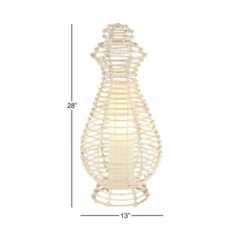 - Lightweight yet sturdy, this beige and black table lamp sits on its hard wicker base and weighs 3.5 lbs.; full measurements are 13″ x 28″ x 13″; easy turn on/off by switch on its cord