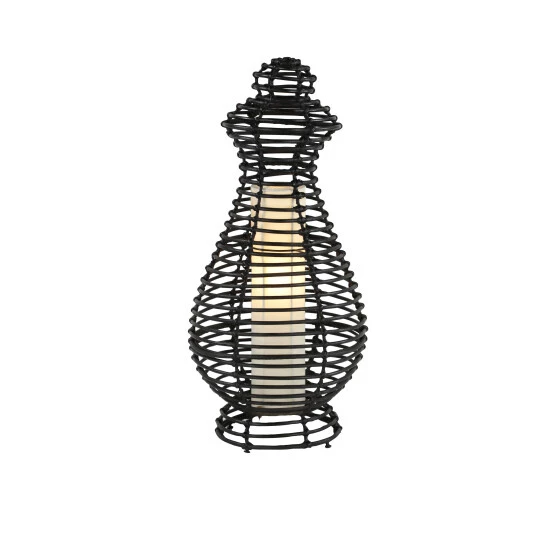 - This lantern lamp’s rounded, amphora-shaped shell is made from 100% strong, palm wicker strips; the interior has tall, metal bars that are wrapped by ivory-colored nylon fabric to softly diffuse the standard-sized lightbulb