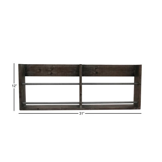 Simple, rustic-styled, large natural wood wall shelf with metal bars serve as a rectangular wall mounted floating book shelf or a neutral-toned decorative wall shelf for your candles and small home decor. The rich mocha brown hue of the wood adds a bold contrast against light-colored walls, while the natural wood grain brings and earthy element to your space. Dark silver-gray iron bars keep your items in place, separated just enough to leave room to display your treasured book covers, candles, and plants.. Chinese fir wood with iron bars. Decorative wall shelf with mocha-colored Chinese fir wood with natural wood grain; 2 horizontal dark gray iron bars across the front to keep books and decor in place. This metal and wood wall rack measures 31.4″L x 4″W x 12″H and weighs 5 lbs.; easy to hang by D-ring hardware in back, 15 lbs. max weight. .