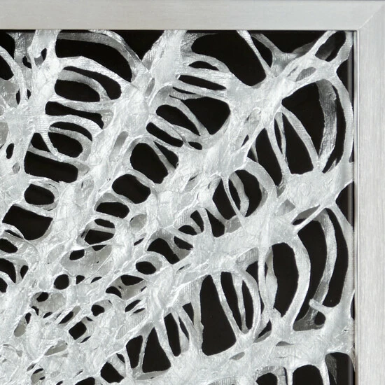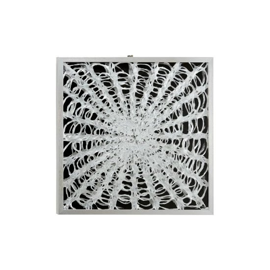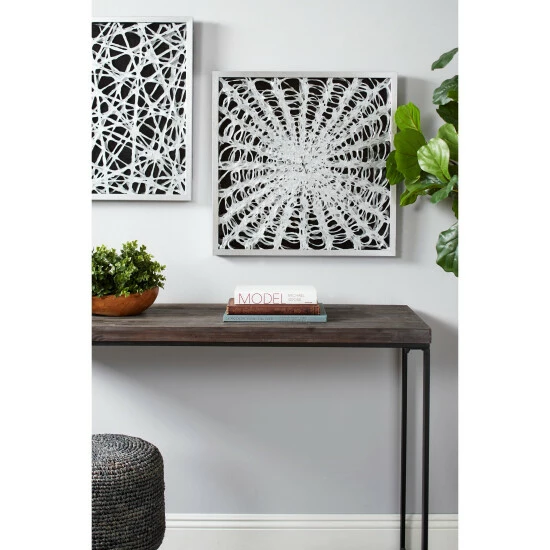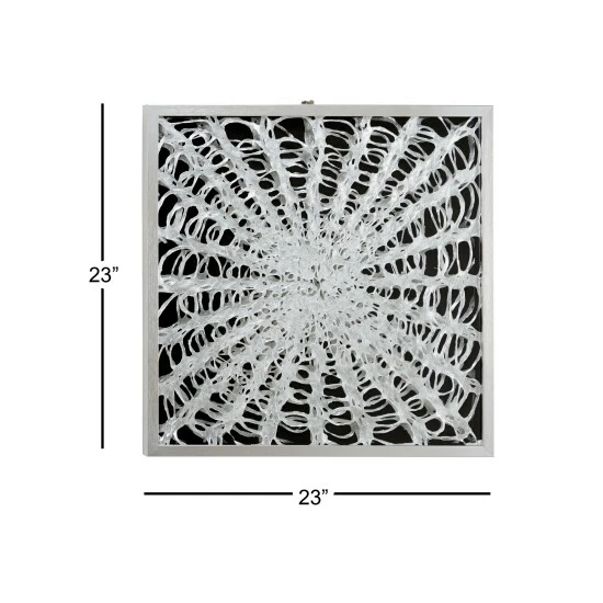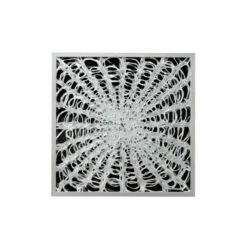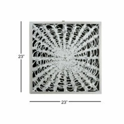 Delicate white paper is intricately cut out into web-like, radial patterns and layered over each other against a juxtaposing black background in this large square 3D wall art. The dimensional paper designs are housed in a clear acrylic frame that fully covers the shadow box. This large wall decor piece suits eclectic and modern style spaces and makes a stunning gift for unique decor lovers!
