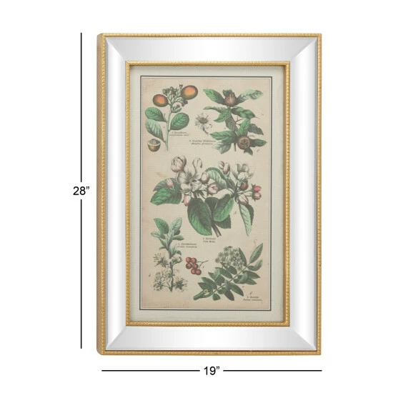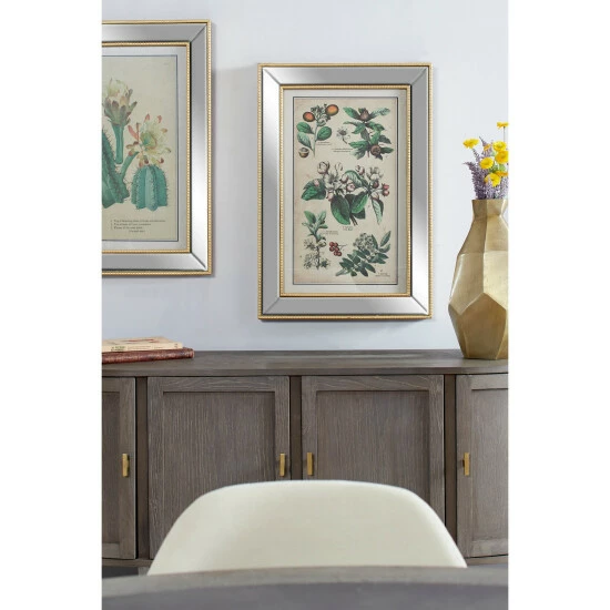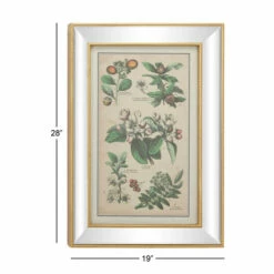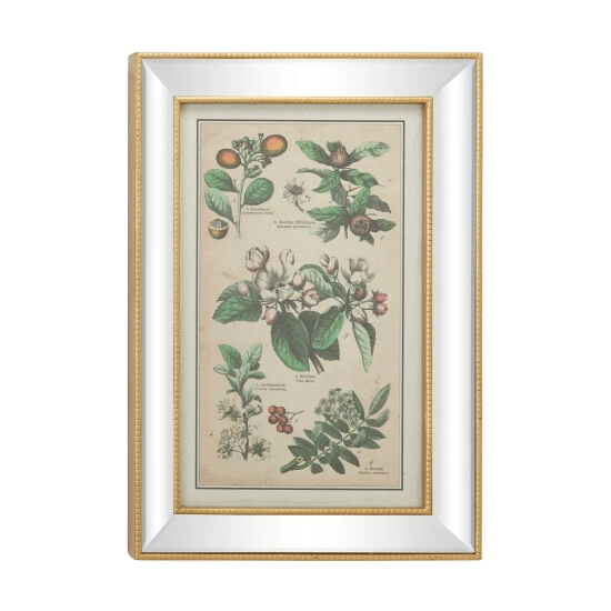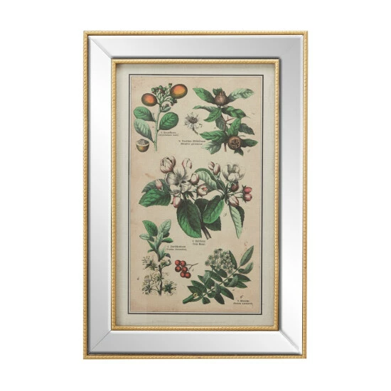 Fine detail and scientific genus and species script bring these botanical illustrations to life in this large, rectangular plant illustration wall art piece… Colorful plum, medlar, apple, and mountain ash plants are drawn with great detail and finished in orange, brown, purple, violet and red hues with dimensional green leaves, depicting vintage style illustrations on a linen textile canvas. This large framed illustration is housed in a reflective mirror and gold wood frame.