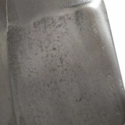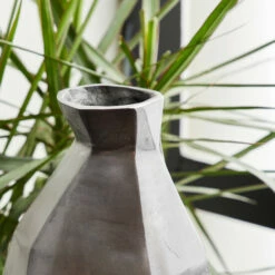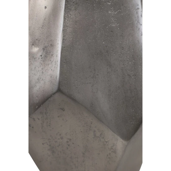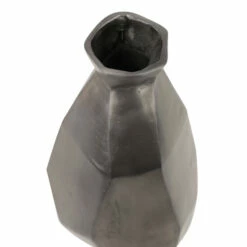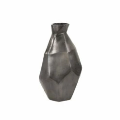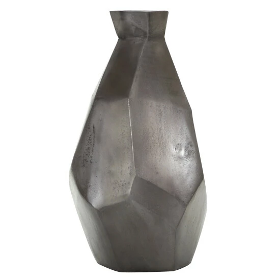 Crafted in India, this dimensional gray metal vase has a modern style silhouette with random angled edges forming a geometric shape. Metallic dark silver hue throughout with both smooth aluminum and textural areas, this large vase will add depth and style to any tabletop or shelf. Display your fresh flowers in this waterproof vase or flaunt as a bold statement piece anywhere in the house needing metallic modern charm.