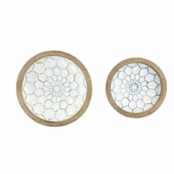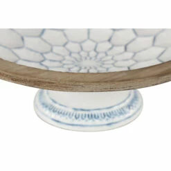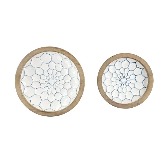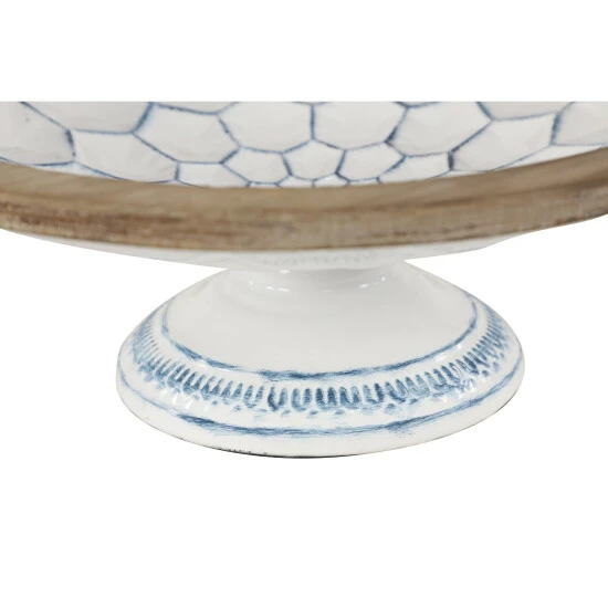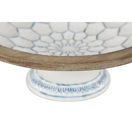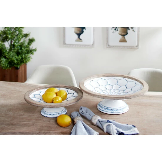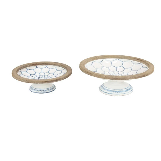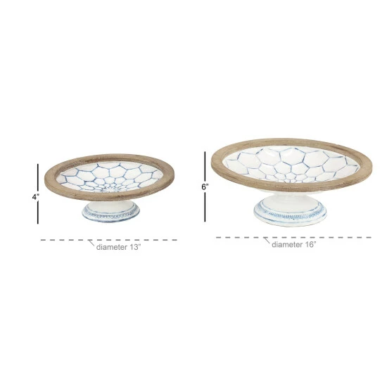 Add Farmhouse charm to your kitchen or tabletop with this set of 2 decorative bowls on pedestals with natural wood trim. Each white bowl is filled with blue-glazed hexagrams and blue decorative borders around each base. Thick, natural Chinese fir wood trim wraps around the top of each large bowl, adding earthy texture.