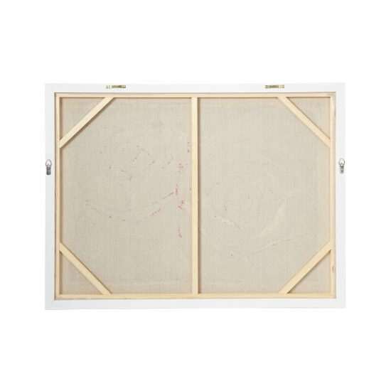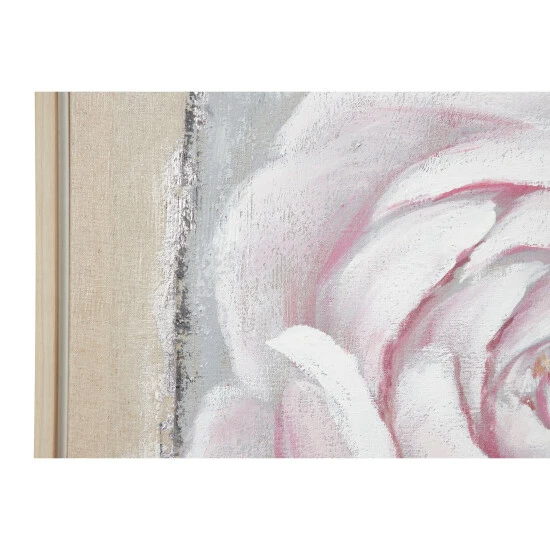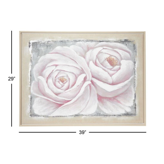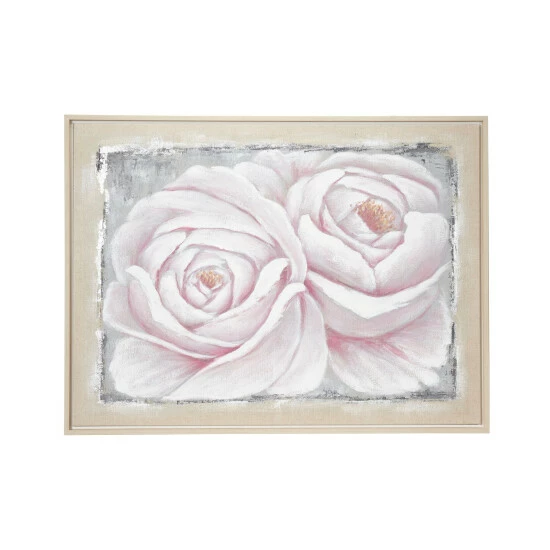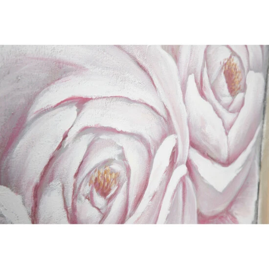 Artfully unrefined in a painterly style with textural brush strokes, this acrylic painting on canvas of pale pink roses with gold stamen brings a soft and natural feel to any space. Wistfully painted in sweeping brushstrokes, the hues are not bright, and very calming, with an acrylic-painted light gray background. The large white and pink petals fill out the canvas to a hand-painted, dark gray lined frame. Around the flowers, a natural frame of the wheat-colored canvas is in view for down-to-earth, unfinished feel to this acrylic painting of flowers.