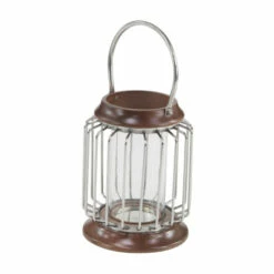 Handmade in India, this large lantern boasts naturally warm brown mango wood segments housing vertical silver metal bars that encase your favorite large pillar candle. Whether you display as a hanging lantern or as table decor, the warm wood adds an earthy touch while the unique cylinder body with steel bars adds a cool, industrial touch. The large handle allows for safe transport when the candle is lit, as well as a secure hanging hardware. No matter where this wood and silver lantern is displayed, it’s sure to bring updated style with ambient lighting to your space.. Large cylinder wood and metal lantern with hurricane glass candle holder, made in India. Natural mango wood upper and base with steel bars and handle; interior glass pillar candle holder (candle not included). Smooth, naturally reddish brown and golden brown mango wood rim and base connecting several metallic silver metal vertical bars that house the clear hurricane glass candle holder; large, metallic silver metal handle for safe and easy carrying and to display as a hanging lantern. Large metal and wood lantern measures 9″L x 9″W 11″H and weighs 2.1 lbs.. Versatile style decorative lantern that holds one pillar candle, suitable in industrial, farmhouse, and eclectic-styled spaces