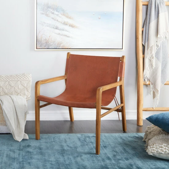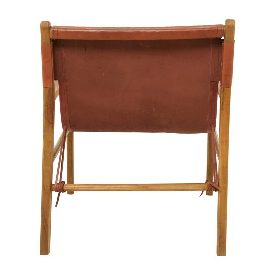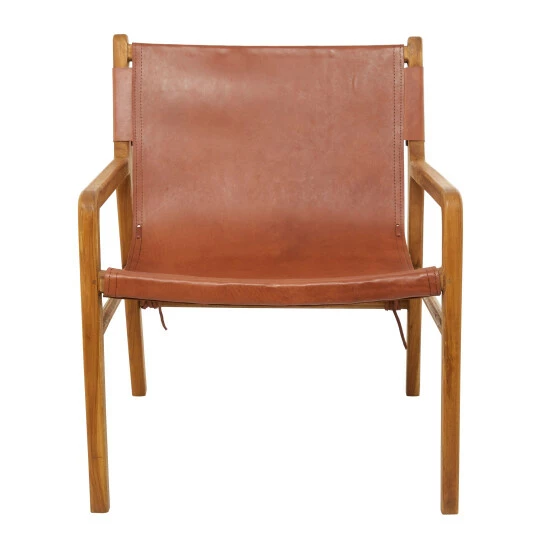 Kick back and relax as you wine down from a long hard day at work. A robust structure with eye catching design for comfortable seating anywhere in your home. Brown wood and genuine leather accent chair that fits any decors and creates a comfortable seating in your modern style home. This item ships in 1 carton. Leather seat cushion with 0.30″ thickness. Wipe clean with a dry cloth. Suitable for indoor use only. Leather and hair on hide are natural products, and therefore no two will be alike. There may slight variations in pattern, natural blemishes, colors, and overall aesthetic of the product. Holds up to 250 pounds. Made in Indonesia. Modern style.