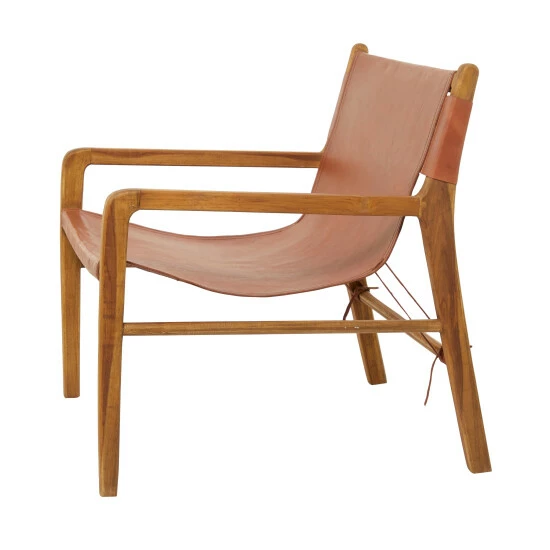 - Modern accent chair made of robust and natural teak wood and genuine leather materials