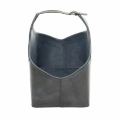 - This leather and wood magazine holder features a gray or brown basket style structure with solid pattern and stud accents as well as a belt inspired handle secured by a metal lock