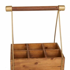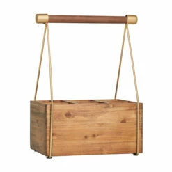 - Rustic wine bottle holder features a naturally textured light brown wooden body with matte gold accent body handles